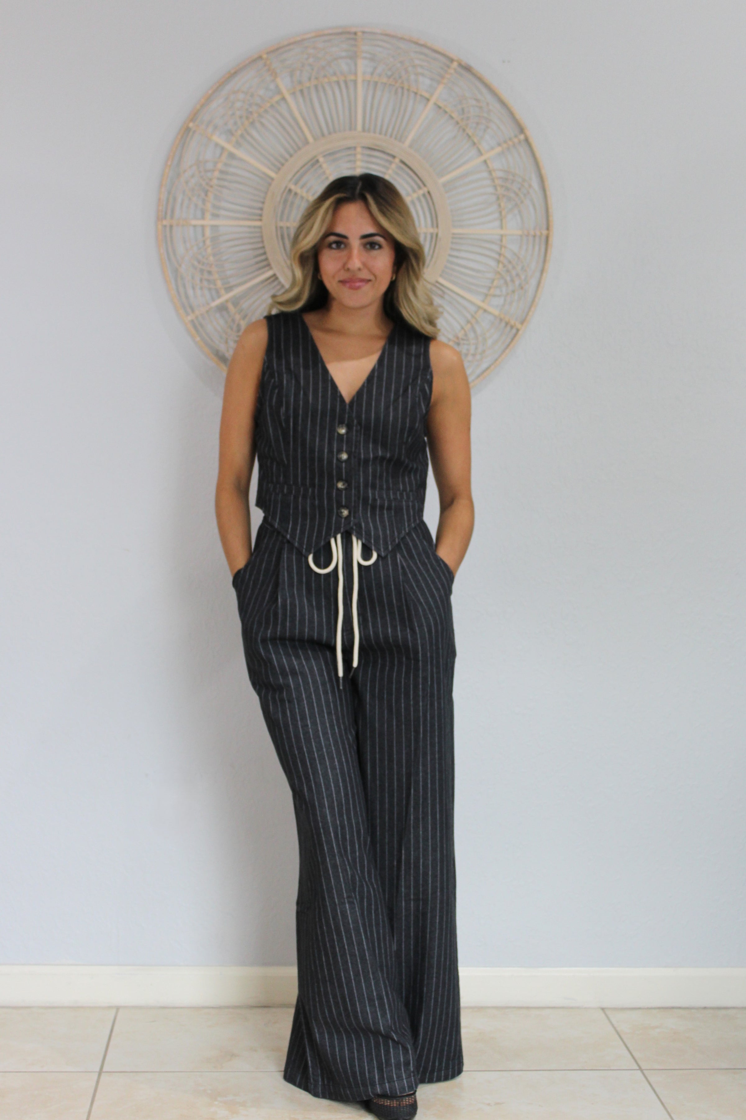 Sharp yet effortless, this black denim set combines a tailored vest with matching wide-leg pants for a polished, fashion-forward look. Detailed with cream pinstripes, it puts a contemporary twist on classic suiting. The pants feature a cream drawstring waist that blends comfort with style, while the structured vest adds sophistication. Whether worn together for a powerful statement or styled separately, this set is versatile enough for day-to-night dressing.